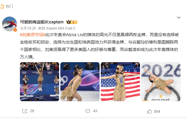 同时,出格是美国的收集上,对于谷爱凌也实施了疯狂的,大量的美国账号用极端的话、谷爱凌,包罗但不限于好比“的”(despicable traitor)、“滚回中国”等。而身披美国国旗的刘美贤,则被美国账号视为美国价值不雅的“最佳代言人”。
